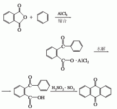 2.酐法 以酐、为原料,以三氯化铝为催化剂,进行付-克(friedel-crafts)反应,然后用浓脱水生成蒽醌。酐法又分为溶剂法、球磨法和气相缩合法。我国大多采用溶剂法,即以过量的为溶剂。此法原料易得,可以从石油做起,具有反应温度低、设备简单、副反应少等优点。缺点是污染严重,三氯化铝废酸水不易处理,而且生产成本高。我国合成蒽醌均采用酐法。原料消耗定额:酐768kg/t、纯700kg/t、(98%)1364kg/t、三氯化铝1554kg/t、发烟1000kg/t。