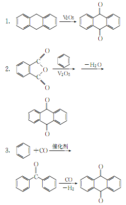 在次世界大战前,蒽醌产量很小,仅有以重铬酸钠将蒽氧化为蒽醌的一种生产方法。20世纪40年代发展了蒽的气相催化氧化法。目前,在美国广泛采用酐法。近年来,又发展了萘醌法和乙烯法。