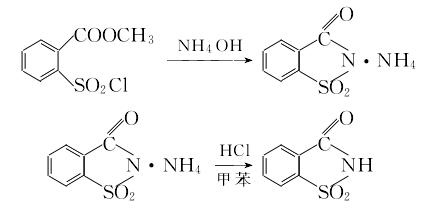 将水和邻磺酰氯甲酸甲酯溶液加入反应锅,冷至10℃,加入氢氧化铵溶液搅拌,温度高达70℃,ph值在9以上反应15min后测试终点(2%联胺吡唑试纸,不立即显黄色为终点),分层取下层铵盐液加入和30%盐酸使ph=1以下,酸析后冷至20℃,分去酸水层、层水洗除氯化铵,得不溶性糖精胶状体。