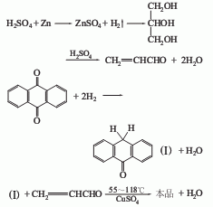由蒽醌和甘油经下述步骤反应而得。(1)蒽醌在铜存在下,用铁粉还原生成羟基蒽酮。(2)甘油在浓作用下失去水分转变为丙烯醛。(3)在存在下,羟基蒽醌和丙烯醛加合,并失去一分子水形成新环。(4)再用氧化成并蒽酮。原料消耗定额:蒽醌(98%)900kg/t、甘油600kg/t、锌粉440kg/t、铜(96%)205kg/t、(100%)5000kg/t。