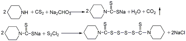 由六氢吡啶、碳酸钠和二硫化碳反应制得五亚甲基二硫代氨基甲酸钠,再用一氯化硫处理即得四硫化双五亚甲基秋蓝姆。