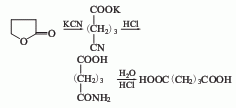 于装有搅拌器、回流冷凝器的反应瓶中,加入γ  -丁内酯(2)86g(1.0mol),氰化钾72g(1.1mol),搅拌下油浴加热至190~195℃,反应2h。反应开始后剧烈进行反应,而后逐渐缓慢下来。冷至100℃,加入200ml热水使之溶解。慢慢加入浓盐酸至使刚果红试纸变色。再加入200ml浓盐酸,搅拌下加热回流1h。减压浓缩至干。将固体弄碎后加入氯仿煮沸提取,每次用氯仿200ml,重复4次。趁热过滤氯仿溶液。合并氯仿溶液,减压浓缩至约400ml,冷却,析出结晶。过滤,冷氯仿洗涤,干燥,得化合物(1)105~110g,收率79.5%~83.5%。用水重结晶,得纯品94~99g,收率71%~75%。[3]
