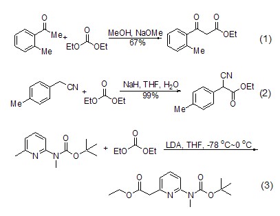 碳负离子的碳酰化  碳酸二乙酯常用于烯醇负离子的碳酰化,该反应的反应条件比较温和,产率较高。在反应过程中,可使用氢化钠、氢化钾、lda(或者其混合物)等作为碱。同时反应底物的选择比较广泛,大多数带有吸电子基团分子[如羰基 (式1)[1]、氰基 (式2)[2]、酯基[3]和烯胺[4,5] (式3 )等]的α-位均可发生碳酰化。