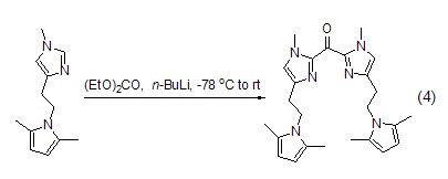 酮、叔醇的合成  将金属有机物与碳酸二乙酯直接反应,可得到酮[6,7]或叔醇[8,9],如由咪唑合成相应酮的反应(式4)。
