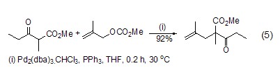 烷基化或烯丙基化  在适当条件下,使用钯-三基膦作催化剂,可实现对β-羰基酯、β-二酮、丙二酸酯、氰化物以及硝基化合物的烷基化或烯丙基化 (式5)[10]