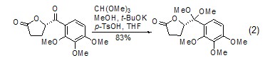 与烯醇(或类似物)反应 烯醇的硅醚 (式4)[7] 或酮的烯醇盐 (式5)[8] 可以与原甲酸酯原位生成的正碳离子反应,生成β-缩醛基酮类化合物。