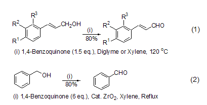 4.是一种常用的氧化试剂或脱氢试剂,因为它很容易被其它化合物还原为对二酚,从而能表现出氧化活性。并且其自身的氧化电位决定了1,4-醌能够在多种醇化合物共存的情况下选择性地氧化共轭的一级烯丙醇,如在二级醇和苄醇共存情况下选择性地将肉桂醇氧化为肉桂醛 (式1)[1]。此外,采用1,4-醌作为脱氢试剂和水合氧化锆作为催化剂还能实现一级醇的氧化反应 (式2)[2]。