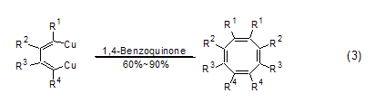 烯基铜化合物,在1,4-醌存在下氧化剂偶联,生成共轭二烯化合物,如二烯基二铜化合物,加入1,4-醌进行自偶联反应,成功地制备了环辛四烯衍生物 (式3)[3]。