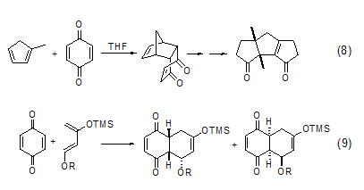 1,4-醌的另一类重要反应是作为亲二烯试剂。因为羰基的吸电子效应,所以1,4-醌是很好的亲电试剂,在电负性的二烯底物存在下可以很容易实现diels-alder反应。很典型的一个例子就是在capnellene试剂的全合成中1,4-醌与1-甲基-1,3-环戊二烯的diels-alder反应为终产物提供了很好的反应前体 (式8)[8]。此外,1,4-醌参与的不对称diels-alder反应也有诸多报道 (式9)[9]。