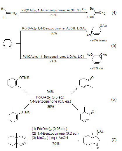 1,4-醌的代表性用途是作为醋酸钯催化反应的共氧化剂,将还原消除后产生的pd(0)重新氧化为pd(ii)进入催化循环。如0.1倍量醋酸钯和1倍量1,4-醌实现的烯烃与醋酸的氧化偶联反应 (式4)[4]。1,4-醌和醋酸钯氧化体系还能较高产率地实现1,3-环己烯向1,4-乙酰氧基-2-环己烯的转化 (式5)[5],反应的产物会受到其它加合物的影响,如在醋酸锂存在下,反应的主要产物是反式的二乙酰氧基化合物;而在醋酸锂和氯化锂共同存在下,反应的主要产物则是顺式的二乙酰氧基化合物。