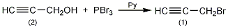 于装有搅拌器、温度计、回流冷凝器、滴液漏斗的反应瓶中,加入炔丙醇(2)112g(2.0mol),搅拌下冰盐浴冷至0℃以下,慢慢加入吡啶18g,冷至-5℃以下,滴加三溴化磷200g(0.74mol),控制滴加温度不超过0℃,约1.5h加完,而后继续搅拌反应0.5h。水泵减压蒸馏,收集全部馏出物,再常压分馏,收集83~89℃的馏分,得炔丙基溴(1)180g,收率76%。注:①加入过程中放热,注意不要一次加入,以免温度上升。[1]