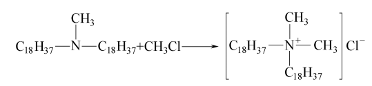 (2)季铵化反应 将双十八烷基甲基叔胺用氯甲烷进行季铵化,反应温度90~95℃,以异丙醇作溶剂,并加入少量的碳酸钠或碳酸氢钠,为了增加氯甲烷的溶解度,促进分子间的接触和反应,反应需在245~294kpa的压力下进行。反应式如下: