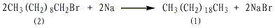 于装有搅拌器、温度计、回流冷凝器的1l反应瓶中,加入450g(2.0mol)w无水1-溴癸烷(2),于120~140℃分批加入金属钠70g(切成小块,每块约3g)。每次加入一块,待反应完后再加入另一块。金属钠反应完后继续搅拌反应30min。慢慢滴加冷乙醇以分解未反应的金属钠。分出上层油层,热水洗涤两次,无水钠干燥后,减压分馏,收集193~198℃的馏分,得正二十烷(1)150g,收率51%。[1]