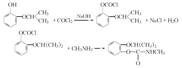 先合成异丙氧基氯甲酸酚酯,再胺解合成残杀威。两步反应均在低温下进行。