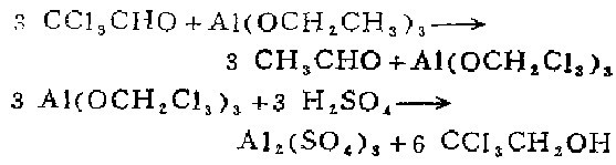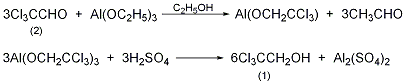 于装有搅拌器、高效分馏柱的反应瓶中,加入无水三氯乙醛(2)250g(1.7mol),无水乙醇700ml,乙醇铝75g(0.46mol),加热至沸,慢慢分馏出生成的乙醛,约24h反应结束。回收乙醇至干,后减压蒸馏乙醇。冷却,慢慢加入20%的,水蒸汽蒸馏。分出油层。水层用钠饱和后提取三次。合并层和油层,无水钠干燥。回收,减压蒸馏,收集94~97℃/17kpa的馏分,得2,2,2-三氯乙醇(1)215g,收率84%,冷后固化,mp16~18℃。[4]