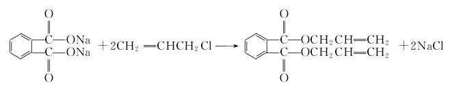1.  酐与液碱反应生成邻二甲酸钠盐,再与氯丙烯40-60℃,常压下酯化而得粗品。经过滤,中和、水洗、减压蒸馏,即为成品。原料消耗定额:酐(≥90%)780kg/t、氯丙烯(≥95)1060kg/t、液碱(40%)1080kg/t。