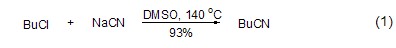 氰基化合物的合成  在合适的溶剂中,活泼醇或卤化物与氰化钠反应可以得到氰化物,此反应为亲核取代反应,是氰化物合成的通用方法。在dmso中,氰化钠与烷基氯反应时,氰基钠比氰化钾的反应产率高,且反应时间要短 (式1)[2]