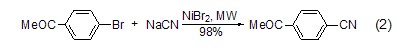 在微波条件下,氰化钠与芳基卤化物的反应是一种快速制备芳基氰化物的方法 (式2)[3]。反应快速且产率很高,是一种很好合成芳基氰化物的方法。