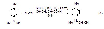 α-氨基氰基化合物的合成  在钌催化和氧气存在下,三级胺与氰化钠反应生成α-氨基氰化合物 (式4)[7],溶剂为甲醇和 (3:1) 的混合物。氧化氰化得到的叔胺是合成α-氨基酸的前体,因此,该方法提供了快捷方便的合成α-氨基酸的途径。