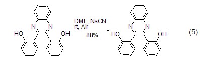成环作用  氰化钠可用作亚胺类化合物二聚成喹喔啉或吡嗪的催化剂,此反应类似于安息香缩合 (式5)[8]。在dmf、甲醇或二氯甲烷/水 (相转移条件) 中,氰化钠快速促进分子内环化得到六元环。