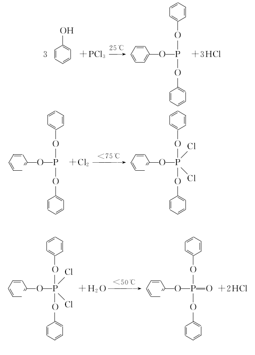 (2)冷法 将酚溶解在吡啶和无水溶剂中,然后于40℃下滴加三氯化磷生成亚磷酸三酯,继续在70℃下通入氯气生成二氯代磷酸三酸,再于80℃下进行水解生成磷酸三酯。水解物经水洗、碱中和、浓缩后进行减压蒸馏得成品。精制方法:常含有酚、磷酸和酸性磷酸酯等杂质。用乙醇或乙醇与溶剂汽油的混合液进行重结晶精制。